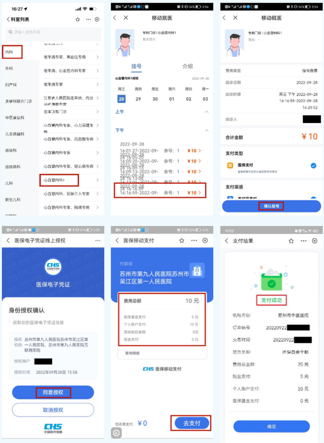 选择挂号科室和专家-医保挂号-授权医保电子凭证-确认付款。