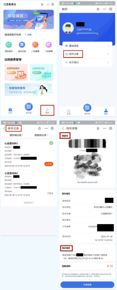 点击“移动就医”-“我的”-“挂号记录”,检索近一周的挂号记录,点开挂号记录明细,可见生成的电子就诊处方号,以及门诊号码、就诊地址等详细信息,患者前往候诊区等待排队叫号。
