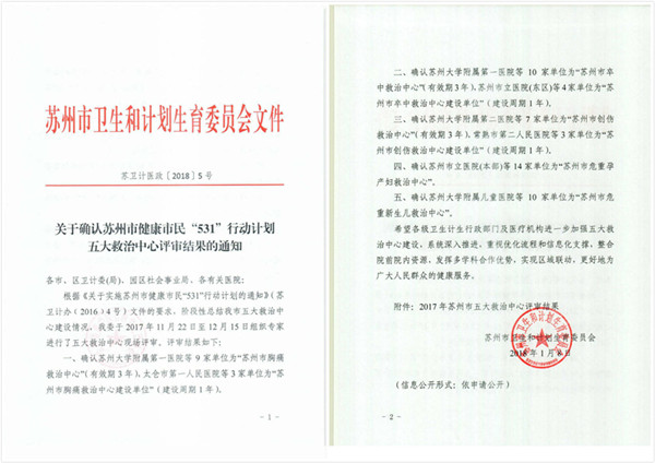 日前,苏州卫计委发出《关于确认苏州市健康市民“531”行动计划五大救治中心评审结果的通知》(苏卫计医政〔2018〕5号)文件,确认我院为“苏州市胸痛救治中心”“苏州市卒中救治中心”“苏州市创伤救治中心”“苏州市危重孕产妇救治中心”“苏州市危重新生儿救治中心”。至此,我院成为此批苏州大市范围内同时通过五个救治中心验收的两家医院之一。