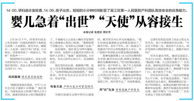 14∶00,孕妇进诊室检查,14∶06,孩子出世。短短的6分钟时间彰显了吴江区第一人民医院产科团队高效安全的应急能力。