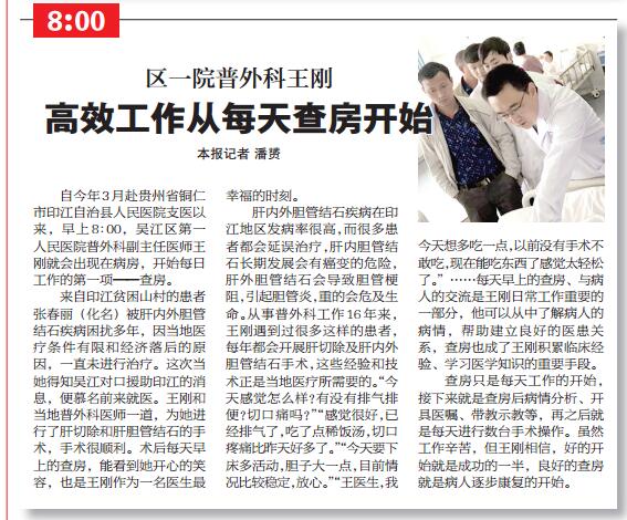 自今年3月赴贵州省铜仁市印江自治县人民医院支医以来,早上8∶00,吴江区第一人民医院普外科副主任医师王刚就会出现在病房,开始每日工作的第一项——查房。