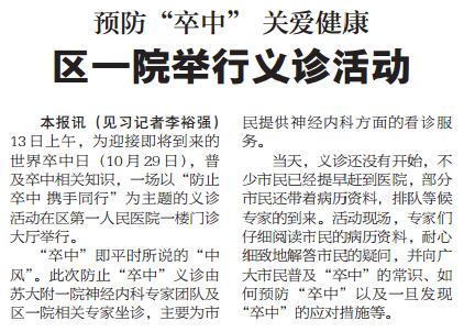 “卒中”即平时所说的“中风”。此次防止“卒中”义诊由苏大附一院神经内科专家团队及区一院相关专家坐诊,主要为市民提供神经内科方面的看诊服务。