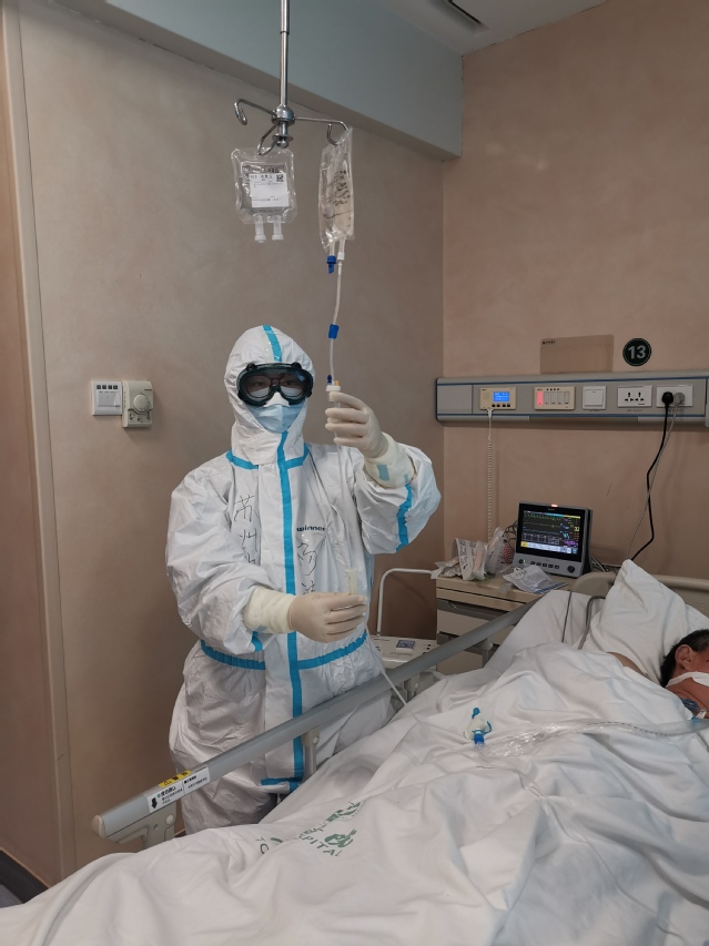 杨琴所在的苏州一队医疗队负责50位重症患者,她每天穿着厚厚的防护服,带着多层手套,连续工作6小时。为了节约穿脱防护服的时间,避免出现交叉感染,杨琴毅然剪掉留了几十年的齐腰发。因对橡胶过敏,双手长满了皮疹和水泡。她总是抢着值夜班,在晚上值班的时间里,同时护理8位重症患者,奔波在不同的病房之间,随时观察他们的生命体征。