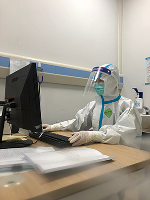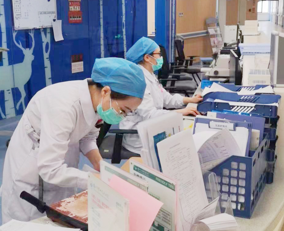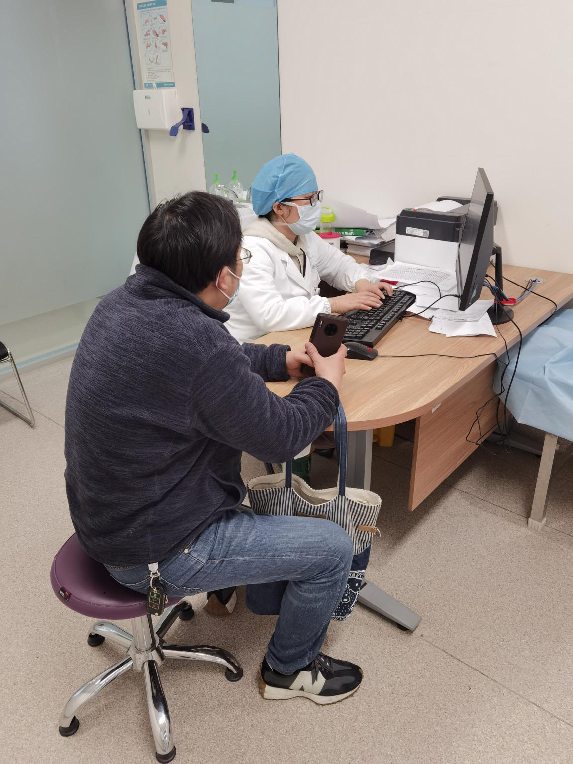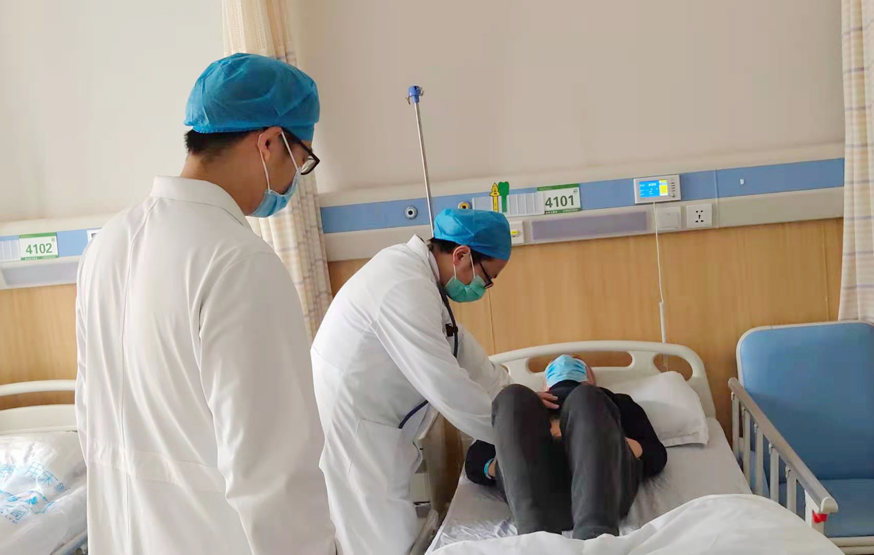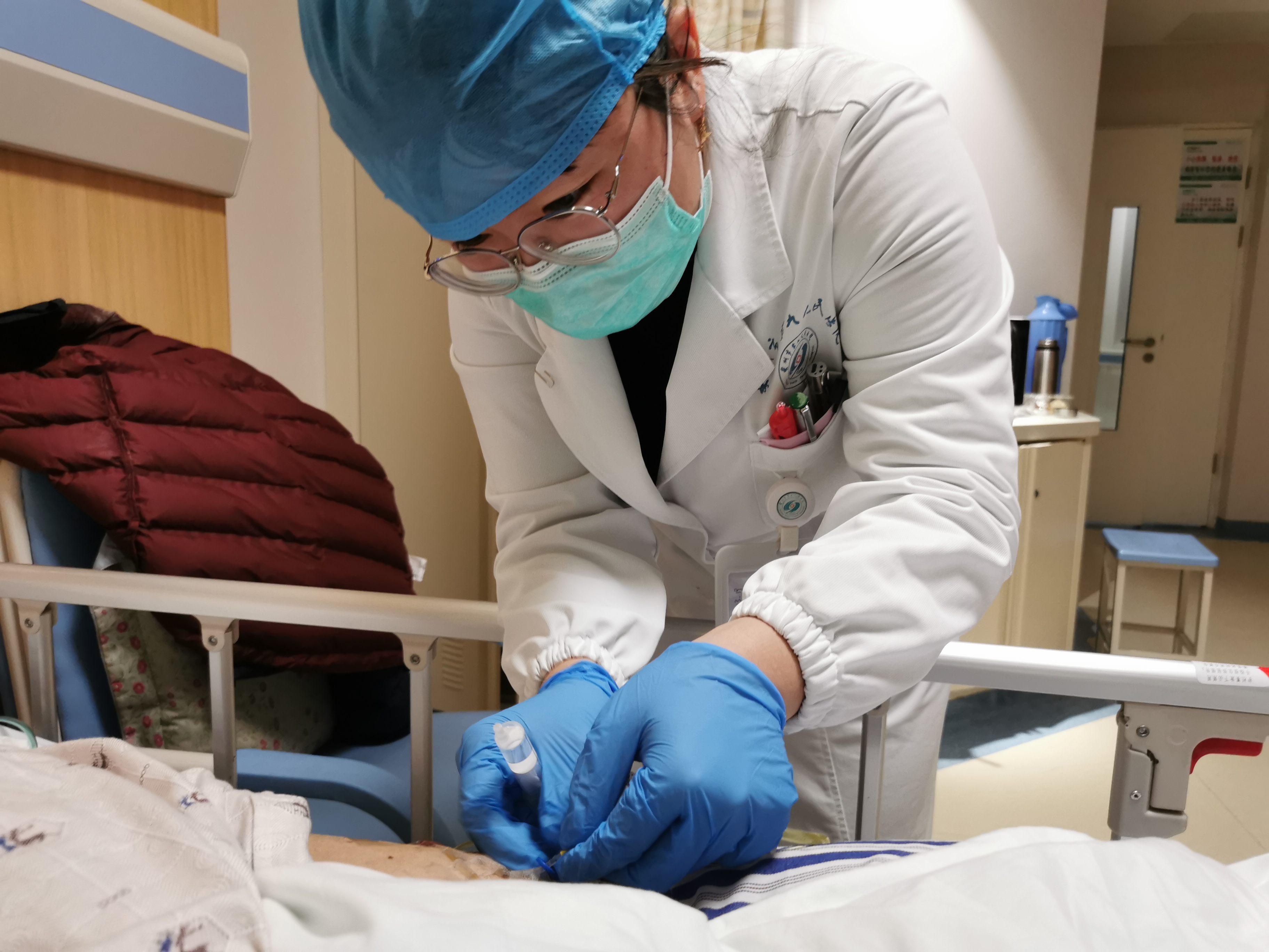 新春佳节,细心地查看每一个患者,忠于职守,全心全意为患者服务。(肿瘤内科41病区)