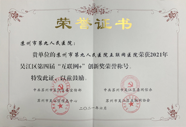 喜讯!苏州九院荣获2021年吴江区第四届“互联网+”创新荣誉称号