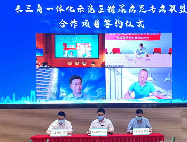 6月17日下午,长三角一体化示范区糖尿病足专病联盟合作项目云签约暨启动仪式在吴江举行。江苏省卫健委医政处处长刘益兵,长三角一体化示范区执委会公共服务和社会发展部部长曹雪娟,吴江区副区长李红,苏州市卫健委二级调研员陈小康等通过线上或线下形式参加启动仪式。