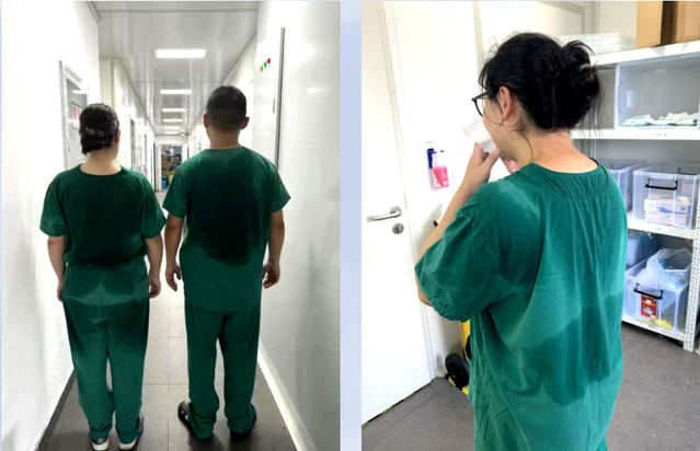 近日天⽓格外炎热,检测⼯作虽在室内进⾏,但防护服密不透风,室内依然⾼温难耐。室外接近40摄氏度的天⽓,实验室内虽然有空调,依然闷热难耐,考验着⼤家的耐⼼和毅⼒。医务⼈员隔离⾯罩下的脸上都是⾖⼤的汗珠,⾼温天⽓下脱了防护服,汗⽔湿透了整个背部。