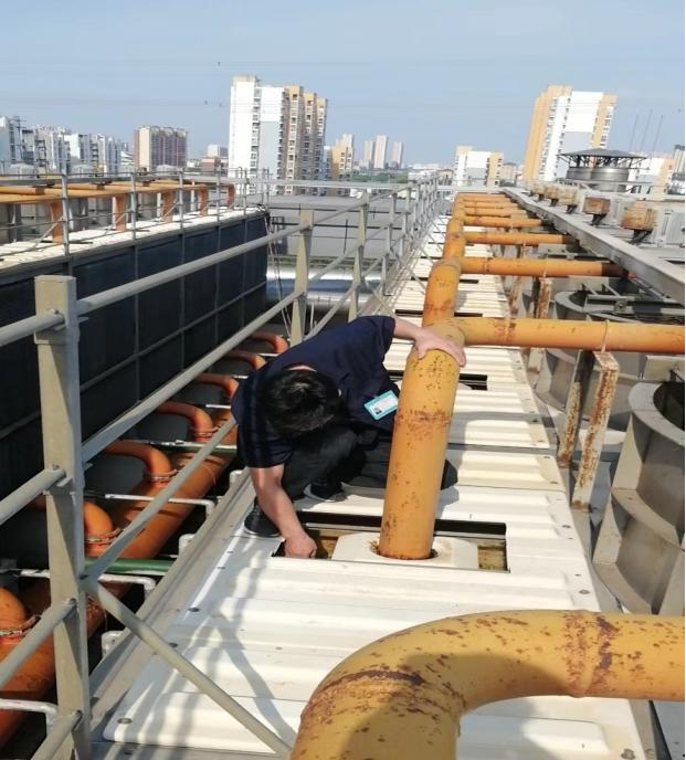 (一)中央空调开启,每天每小时一次的机组巡检成为空调班组成员必做的功课。为了保障中央空调正常运行,从冷冻机组、新风机房、末端风机盘管到楼顶上的冷却塔,运行班组成员全都要“照顾”到,一个都不能少。此时室外温度为38℃,而楼顶上设备的温度更是高达50.4℃,为了给大家送去凉爽,巡检人员承受着户外“烧烤”模式。