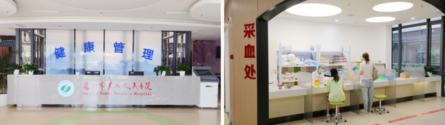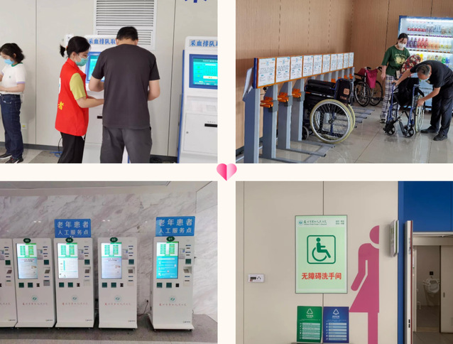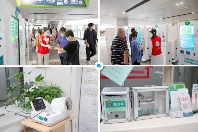 在门诊大厅入口设置无障碍通道,在出口设置爱心专座,方便老年、孕妇等特殊就诊人群出入及临时休息。在门诊一楼大厅及各诊区添置自助血压计,每日诊前分诊护士进行宣教和指导患者如何正确测量血压;各诊区放置身高体重计,门急诊区域投放自助轮椅,各楼层提供饮用冷热水机供患者使用。在门诊大厅、新生儿诊区设立两个母婴室。门诊大厅及各楼层投放自助挂号收费机100多台,集成了挂号、取号、预约、微信与支付宝付费、吴江及苏州医保结算等多种功能。检验科启用排队抽血系统,流程更加合理,检验自助取单机分布于各楼层,便于患者取报告;电子病历实现自助打印,方便患者;药房实行签到后发药机自动配药,提高了效率。