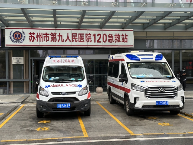 苏州九院120院前急救由苏州市急救中心统一调度,急救站由急诊医学科管理,实行一体化管理运作模式。现有九院分站和流虹路分站两个站点,固定工作人员20名,其中管理人员1名,急救医师8名,护士9名,驾驶员8名,每月有病区住院医师轮转到120参与院前急救工作。现有参与急救工作救护车6辆,每天3辆值班车,其中流虹站点2辆,九院站点1辆。全部车辆按照苏州市531行动计划,均进行了麦迪斯顿智慧急救系统改装。