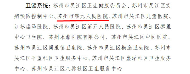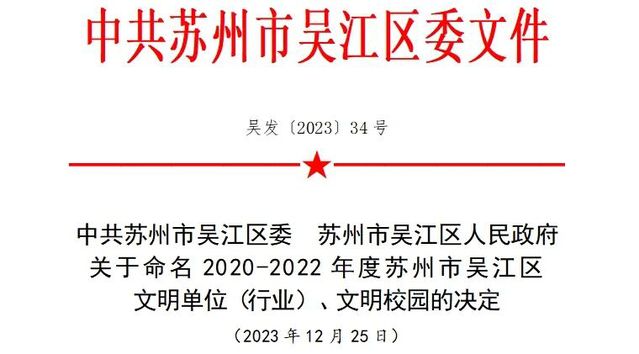 近日,中共苏州市吴江区委办公室发布《中共苏州市吴江区委 苏州市吴江区人民政府关于命名2020-2022年度苏州市吴江区文明单位(行业)、文明校园的决定》。苏州九院榜上有名,被命名为“苏州市吴江区文明单位”。