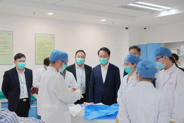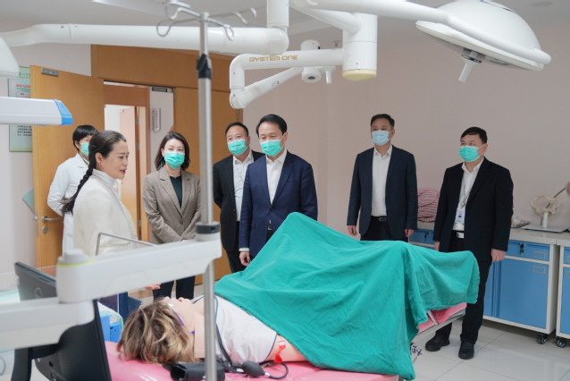 调研中,詹启敏一行实地走访了医院门诊大厅、中心实验室、技能培训中心、院史馆,详细了解医院的科研攻关、技能培训及医院的发展历程。