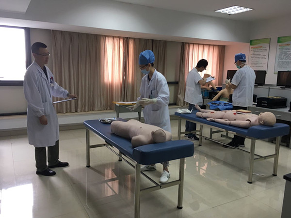 在技能室里,技能大赛如期举行,来自徐州医科大学、南通大学及长沙医学院临床专业实习医师共42人参加比赛。来自内、外、妇、儿各教研室的7位专家老师担任评委。