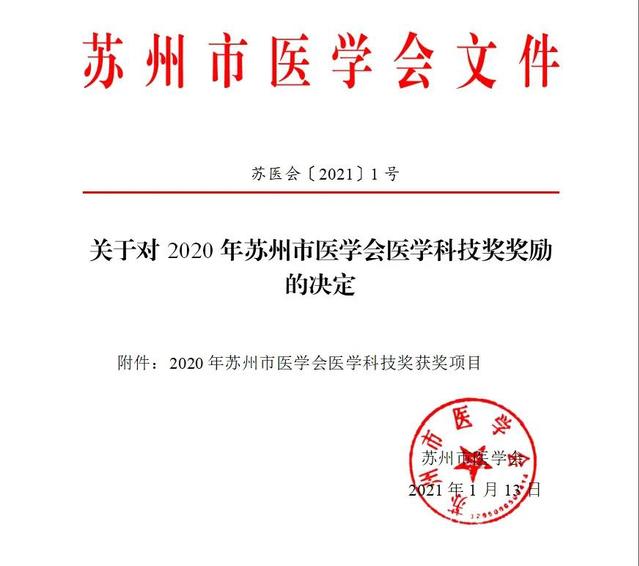 根据《苏州市医学会医学科技奖奖励办法》及《苏州市医学会医学科技奖奖励办法实施细则》规定,经单位推荐、形式审查、初审、公示及终审,并经苏州市医学会医学科技奖评审委员会审议通过,共评选出2020年苏州市医学会医学科技奖一等奖5项,二等奖10项,三等奖20项。