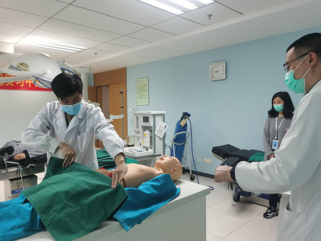 实习生技能操作考核分为临床思维和技能操作,按照抽签,7名徐州医科大学临床专业实习生进行线上临床思维考核,2名实习生在临床技能中心进行内外科站的临床技能操作。技能操作考官由徐州医科大学内科专家孔令文主任和九院外科教研室秘书陈皓主任担任。