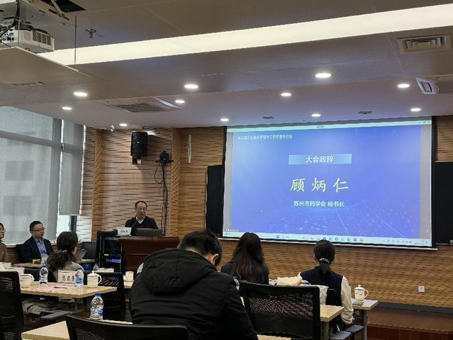 苏州九院药学部主任沈明丰主持论坛,副院长郎建华开幕致辞。苏州市医学会秘书长谭秋生、苏州市药学会秘书长顾炳仁作重要讲话。