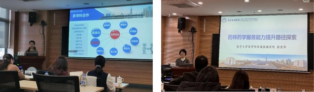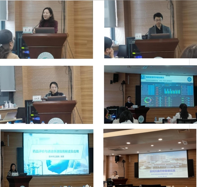 在随后的授课环节中,来自东南大学附属中大医院的邵华主任、常州市第二人民医院的苏丹主任、南京市鼓楼医院的张晋萍主任、苏州大学附属第一人民医院的朱建国主任、苏州大学附属第二人民医院的潘杰主任、江苏省人民医院袁红宇主任等多位省、市级药学大咖分别从DRG、国考背景下的药事管理、智慧药学平台的构建等多个角度,分享了当前医改形式下对药事管理的探索和实践。从抗菌药物、超说明书用药管理、科室质控、药品遴选、基层药学服务等多个方面,阐述了药学服务模式的探索和实践,向与会人员展示了保障患者合理用药先进做法。苏州九院药学部作为东道主,也由骨干药师宋秋萍分享了关于老年骨质疏松药学服务方面的工作经验和心得。