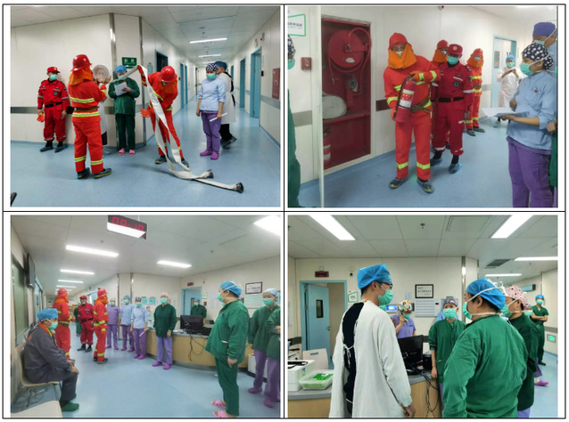 演练场景为现场模拟一手术间内突发火灾事故。手术间内巡回护士第一时间发现火情后,评估火势较大需立即停止手术,撤离病人,快速通知吧台护士请求支援。吧台护士接到支援电话后立即按下火警手动报警器,拨打火警电话汇报现场情况,并汇报科主任、护士长,同时安排推车入手术间进行病员转运。