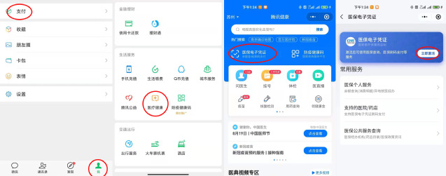 打开“微信”,点击右下方“我”,选择“支付”,选择“医疗健康”,点击“医保电子凭证”,没有激活的点击“立即激活”。按提示流程激活医保电子凭证。