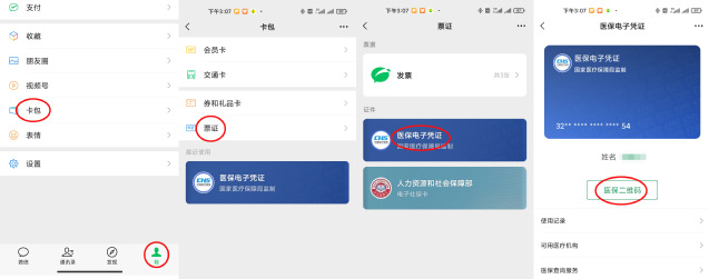 打开“微信”,点击右下方“我”,选择“卡包”,进入“卡包”后选择“票证”,在证件中选择“医保电子凭证”后点击“医保二维码”,即显示二维码,可直接用于扫码结算。