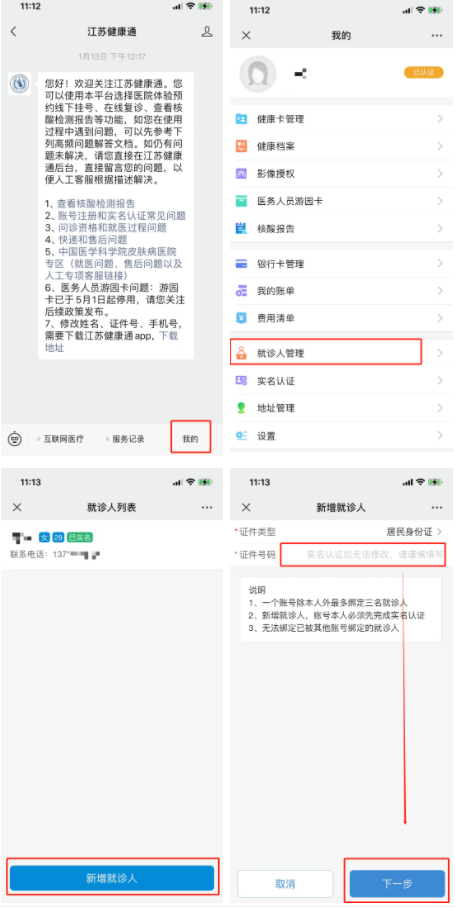 3.儿童或老人不会用互联网的,监护人可协助就诊,监护人注册并实名认证后,在江苏健康通——我的——就诊人管理中添加儿童或老人为就诊人,就诊时,选择对应的需要就诊的患者即可