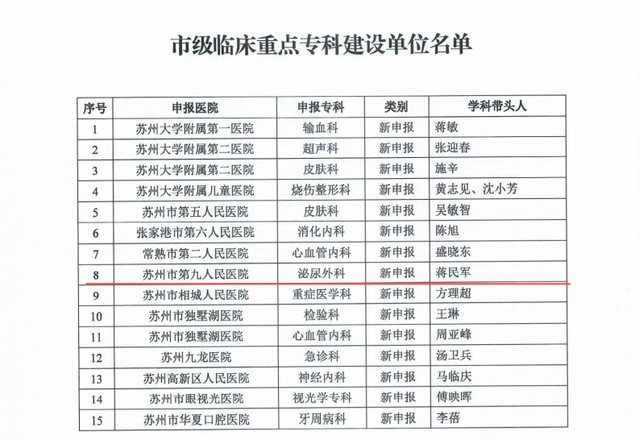截至目前,医院已拥有苏州市临床重点专科9个(含建设单位)。下一步,医院将进一步加强各级临床重点专科建设与管理,认真规划、严格要求、对照相应的技术标准、评分标准,坚持目标导向、问题导向,给予更加有力的配套政策,加大临床技术创新力度、人才队伍建设力度,争取获得更好的成绩。