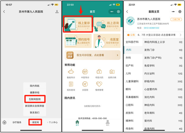 呼吸与危重症医学科、消化内科、心血管内科、内分泌科、肿瘤内科、新生儿科、儿童保健科、皮肤科、康复医学科、精神(心理)等所有互联网线上开诊科室,互联网医院”选择“线上复诊”或者“线上咨询”,选择对应科室。