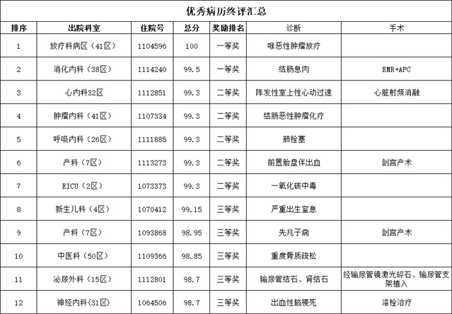 本次活动本着公平、公正、公开的评比原则,严格按照评选办法,综合两轮初评及病案管理委员会委员们的终评意见,按最终病历评选得分,评比出了一等奖2名,二等奖5名、三等奖5名。