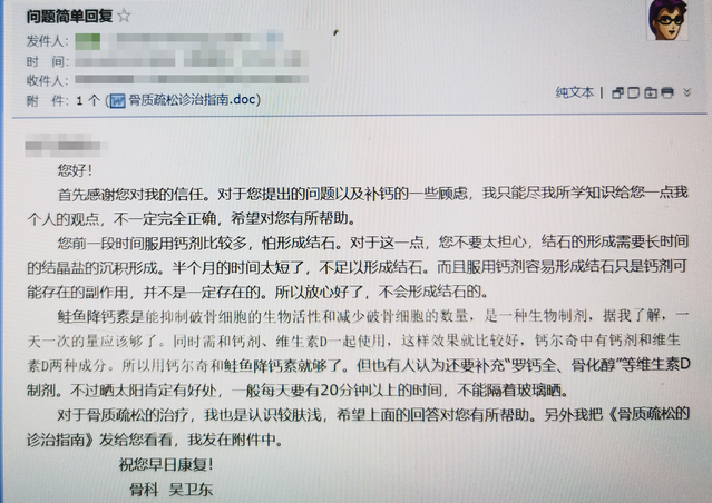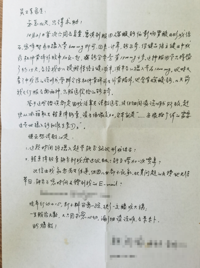 短短数十日的相处,阎老太太对吴卫东和医护人员的信任感与日俱增。出院后,老太太有骨质健康方面的问题,还多次通过信件、邮件的方式咨询吴卫东,吴卫东一一回复,每次的回复内容尽可能用通俗易懂的语言。