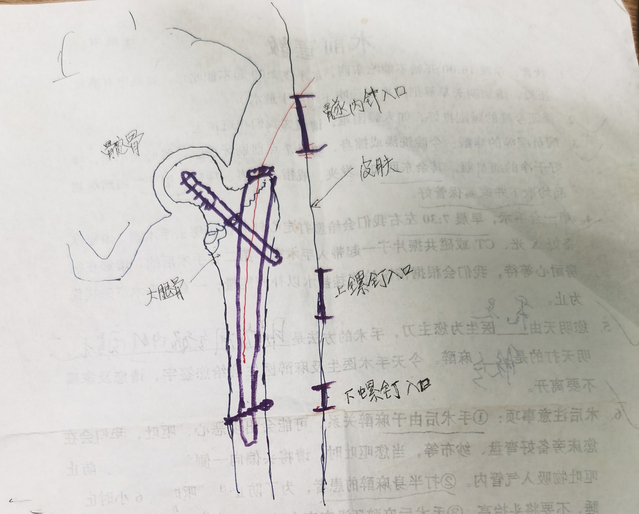 她80多岁,因骨折入院接受手术,医生为她画了一张术前草图。