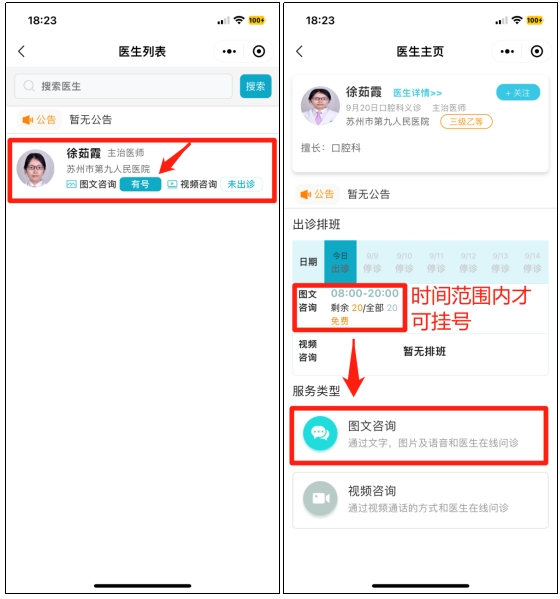 ”选择口腔科--9月20日口腔科义诊-- 医生(显示有号源)--图文咨询--填写信息提交问诊--等待医生接诊。