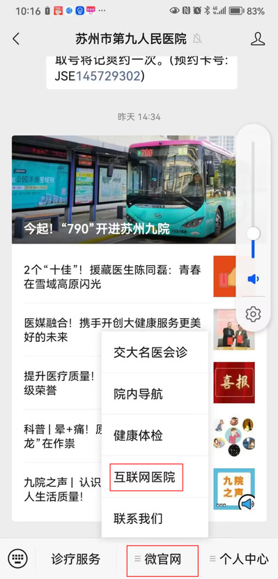 ✔登录苏州九院微信公众号,点击“微官网”选择“互联网医院”。