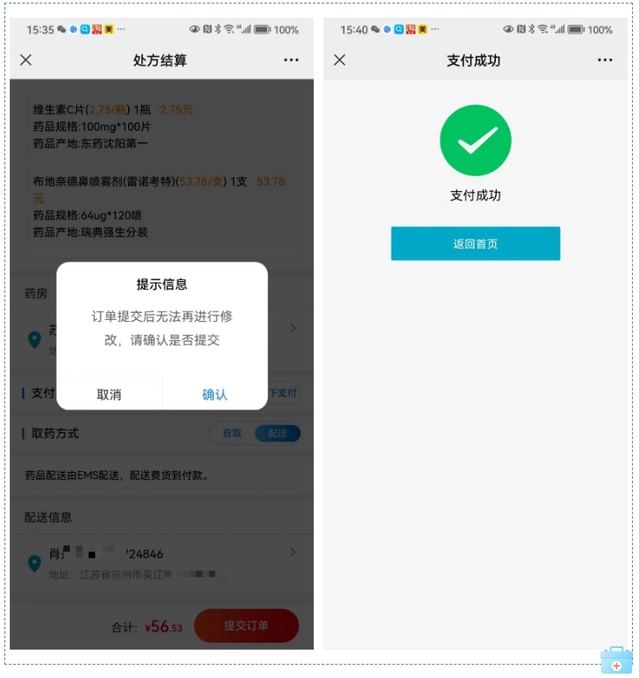 ✔查看已审核处方,选择取药方式+填写收货地址后,提交订单。