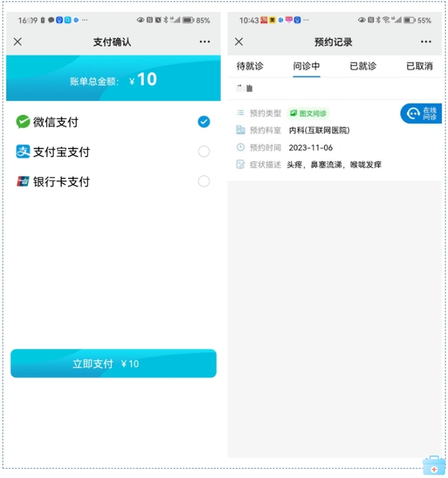 ✔预约成功后支付挂号费,对应的医生收到短信通知后,会登录APP进行问诊。