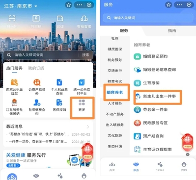 2.在“苏服办”小程序主页,选择“更多”,进入“婚育养老”专栏,点击“新生儿出生一件事”。