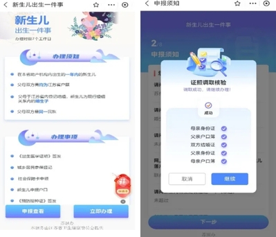 新生儿出生“一件事”无需用户上传任何材料,仅需用户授权通过电子证照库调用夫妻双方的身份证、结婚证、户口本证照即可。