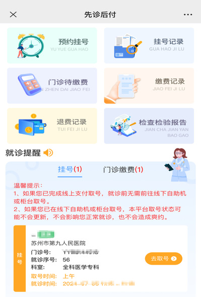目前,麻豆传媒 先诊后付系统已构建完成,苏周到App、苏州医保微信公众号、麻豆传媒 公众号均可使用,预约挂号及诊间支付已同步完成。