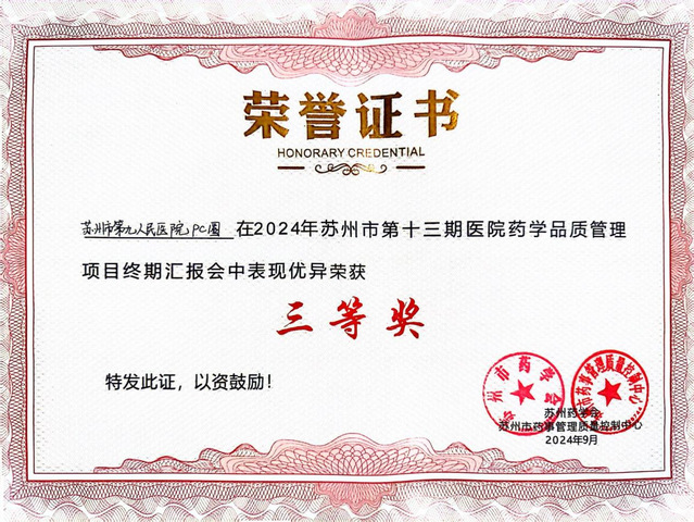 近日,在苏州市第十三期医院药学品质管理项目终期汇报会中,苏州九院药学部参赛项目“PC圈”通过层层角逐,从全市39个品管圈项目中脱颖而出,荣获赛事三等奖。