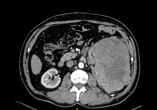 经过CT等检查,发现陈先生的左边肾脏上长了一个巨大的肿瘤,大小约16.6cm*11.1cm,也正是因为这个原因,导致了腰痛、血尿、排尿困难等一系列症状。