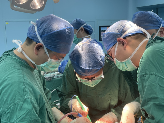 经过周全的术前准备,郑朝旭主持这场高难度手术。考虑肿瘤贴近第二肝门,位置深,具有较大手术风险,术前给予肝脏肿瘤3D重建,充分评估肿瘤与血管位置,制定详细手术计划。术前备血,术中经多通道补液治疗,维持患者血压稳定。术中探查发现腹腔积血,肿瘤包膜破裂,手术过程中仔细分离周围组织,彻底止血,完整切除肝肿瘤,并充分冲洗腹腔。