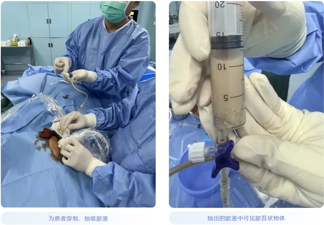 为患者穿刺、抽吸脓液抽出的脓液中可见脓苔状物体