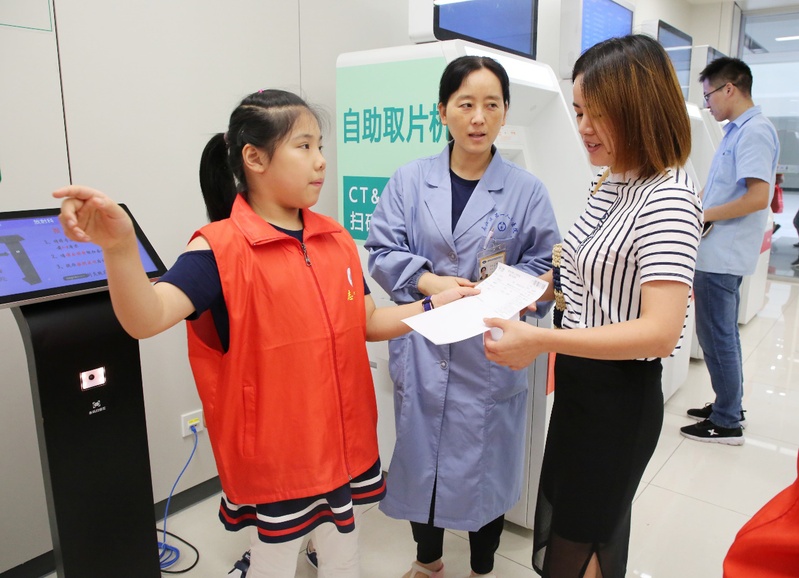 当天上午,小志愿者穿上标志志愿服务的红色马甲,立马变得认真而庄重。在医院门诊部工作人员的带领下,小志愿者们参观医院布局,了解就医流程。