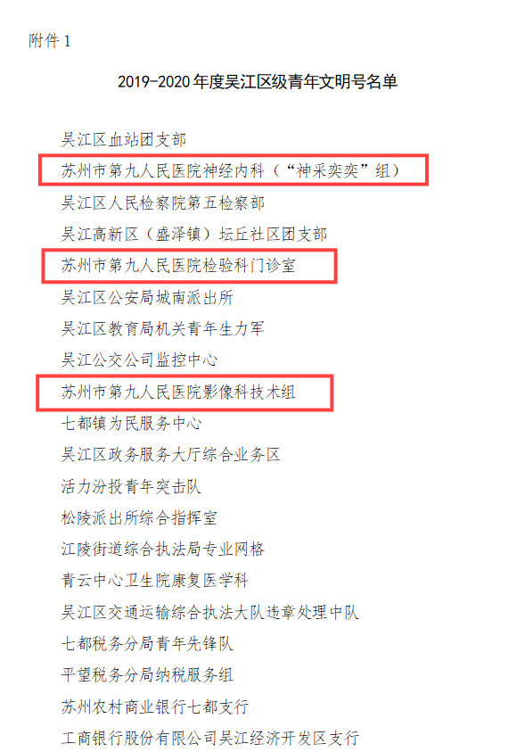近日,吴江区团委印发《关于命名2019-2020年度吴江区级青年文明号的决定》,苏州九院神经内科(“神采奕奕”组)、检验科门诊室、影像科技术组与其它22家青年集体被命名为2019-2020年度吴江区级青年文明号。
