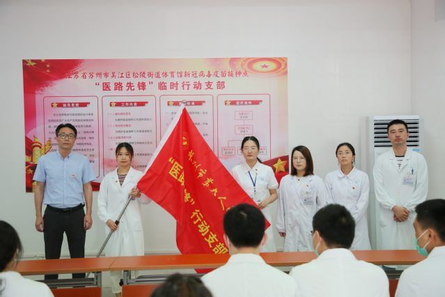 苏州九院党委组织委员、副院长叶福龙为“医路先锋”临时行动支部进行授旗。
