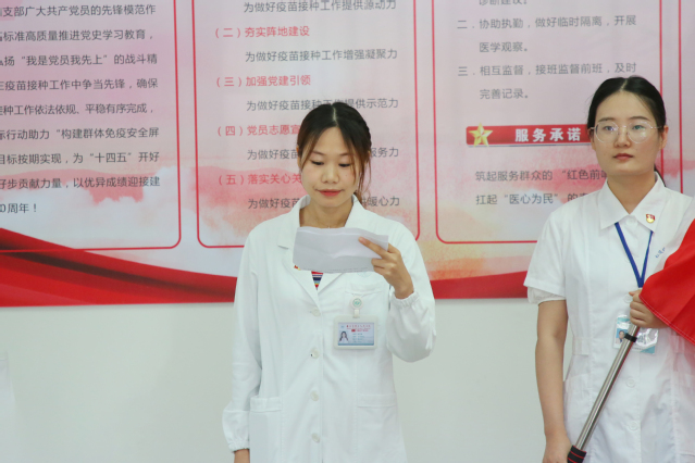 临时行动支部书记金文娟代表支部党员作庄严承诺:积极发挥行动支部的战斗堡垒作用,不负群众所托,筑起服务群众的“红色前哨”,扛起“医心为民”的责任担当,坚决保障全民新冠疫苗接种任务的顺利完成。
