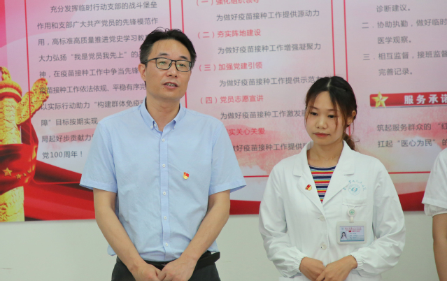 苏州九院党委组织委员、副院长叶福龙要求行动支部的党员同志和青年志愿者们继续发挥好先锋模范作用,严明纪律,互帮互助,积极、稳妥、有序、高效的做好大规模人群疫苗接种工作,早日形成人群免疫屏障,有效阻断疫情传播,为抗击新冠疫情做出贡献。