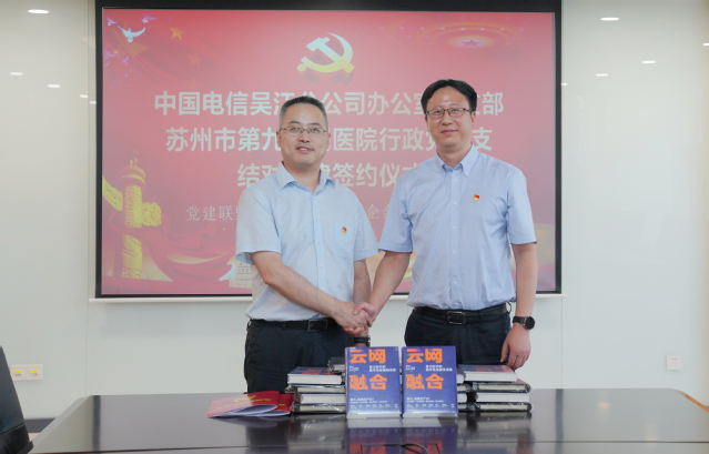 中国电信吴江分公司办公室党支部书记、办公室主任王江峰与苏州九院行政党总支书记吴国良签订党建共建协议书,双方将以此次党建共建结对合作为契机,积极探索创新党建活动新形式,发挥各自优势,统筹双方资源,推动双方党建实现资源互享、互利共赢、共同发展。