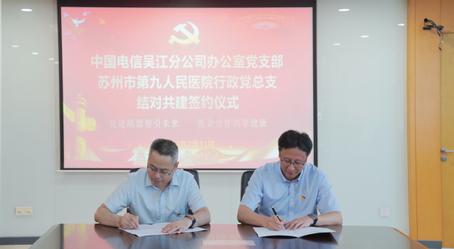 7月11日,中国电信吴江分公司办公室党支部与苏州九院行政党总支开展党建结对共建签约仪式。双方以支部共建为平台,深化合作、互相促进,不断扩大区域化党建“朋友圈”,汇聚党建融入业务的强大合力。