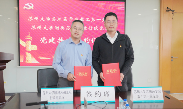 为贯彻落实党的二十大精神,增强党建整体效应,10月25日,苏州大学苏州医学院教工第一党支部与苏州大学附属苏州九院行政党总支开展党建结对共建签约仪式。双方以支部共建为平台,深化合作、互相促进,实现党建工作与中心工作更加紧密融合。签约仪式前苏州大学附属苏州九院党委副书记、纪委书记庾勍主持会议并介绍医院情况。苏州大学苏州医学院党工委副书记吴德建介绍苏州医学院发展概况。双方就资源优势、共建内容等进行深入探讨和对接。