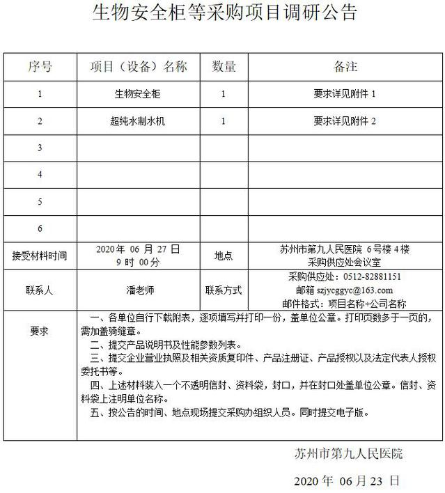 生物安全柜等采购项目调研公告
